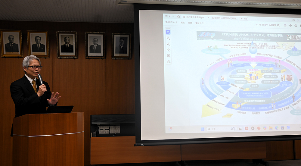 「奄美群島共創連携推進センター」が中心になって準備を進めており、現在は本学のある郡元に設置してあるセンターを、奄美市名瀬にある分室に移す予定。多くの学生・研究者の長期滞在が可能になるよう、産・官・学だけでなく、金融機関、メディアとも連携し、共同キャンパスプラットフォームの設置を目指す。いずれは鹿大の学生だけでなく、県内、大都市圏の他大学の学生も、ともに奄美キャンパスで学べるようにすることで「地方都市の価値を生み出し、地方の豊かさを見直して、新たな地方活性化につなげていきたい」と話していた。