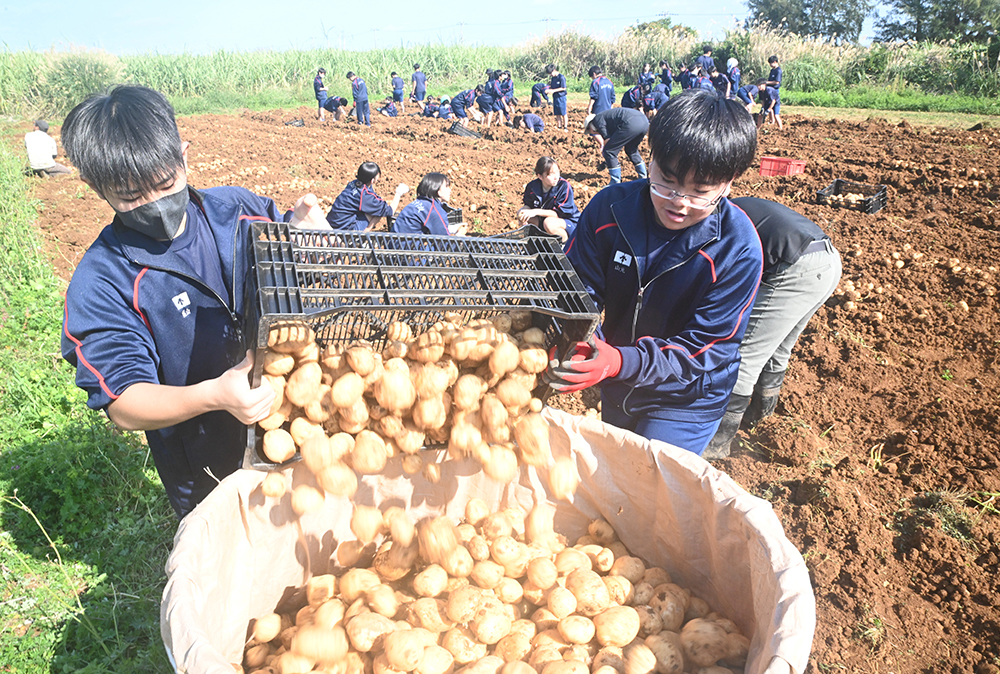 収穫したバレイショを袋に入れる生徒ら(5日、知名町)