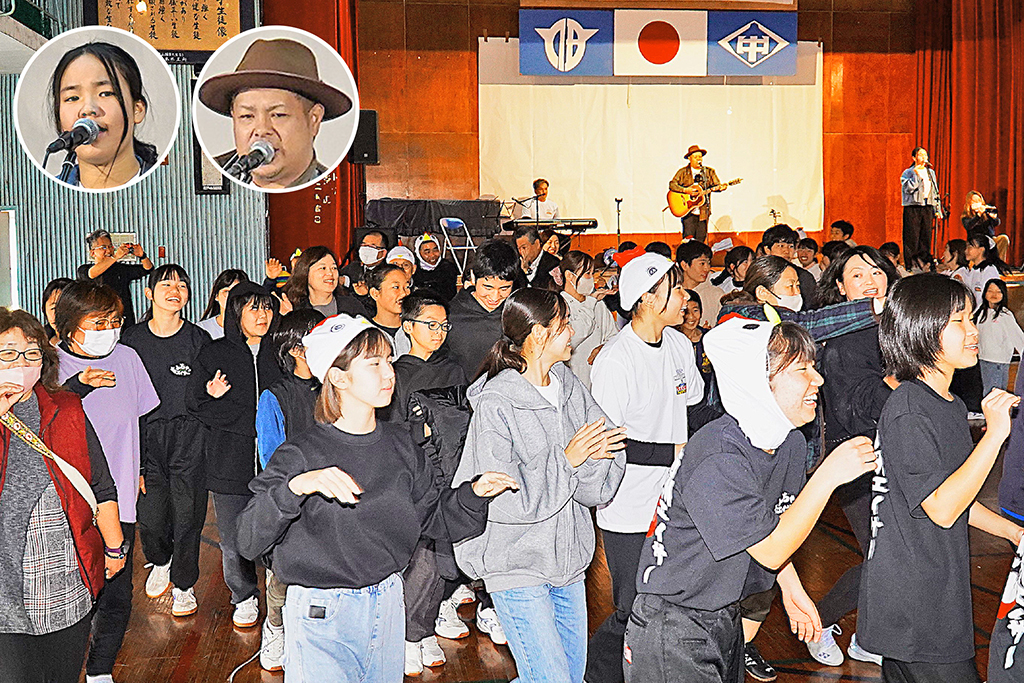 ゲストには、同校のオリジナル応援歌「前進」を制作してプレゼントしたシンガーソングファーマー禎一馬さん(43)=天城町=と、中学生シンガー「しずく」(芳村しずくさん・犬田布中2年)を招いた。禎さんは農業の傍ら地域応援ソングを発表し、教育現場への無償ライブ「音返し」プロジェクトにも取り組んでいる。
