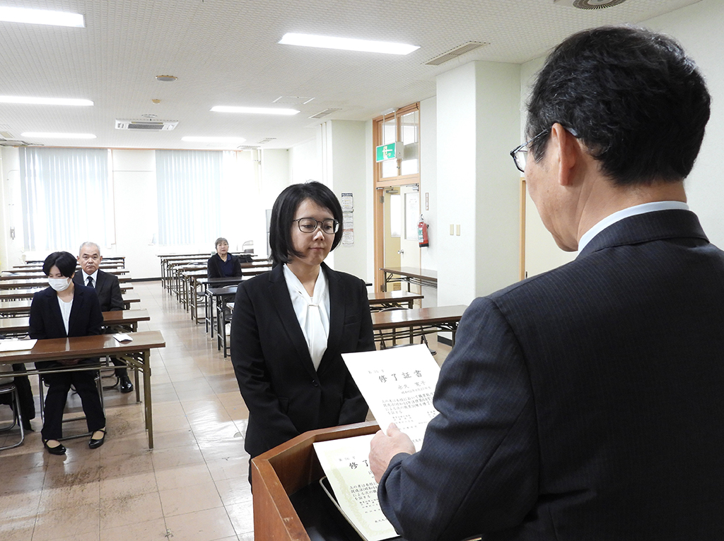 吹上高専の上原順郎校長は「介護職は、介護される側の家族の生活を支える一面もあると感じている。就職後もスキルアップし、新たな資格に挑戦してほしい」と式辞を述べ、ベートーベンの「第九」交響曲第4楽章「歓喜の歌」をドイツ語で歌い、修了を祝った。