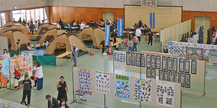 会場のりゅうゆう館アリーナでは展示コーナーが設けられた。健康部門、大島紬展示、各学校・保育所(園)による作品展示、県立奄美少年自然の家コーナーなどで、来場者が見学する様子が見られた。