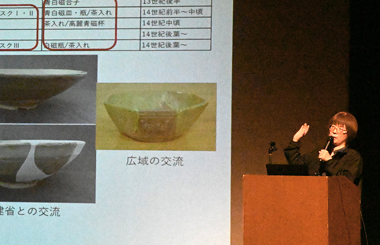 柴田氏は、今帰仁グスクのほか、沖縄本島や奄美群島の遺跡から出土した陶磁器の種類や出土量を調べた結果、今帰仁グスクでは13世紀後半~14世紀前半に貿易による陶磁器が増えている特徴があるとし「福建白磁や青磁の良品などが多く、広範囲から陶磁器が流入している。福建からの陶磁器の大きな流れがあり、今帰仁グスクが主要な消費地になっている時期が存在するのではないか」とした。また、琉球から明時代の中国に輸出されていた硫黄に注目し、「硫黄鳥島産の硫黄が、沖永良部から与論、今帰仁へ至る交易ルートがあったのではないか」と話した。