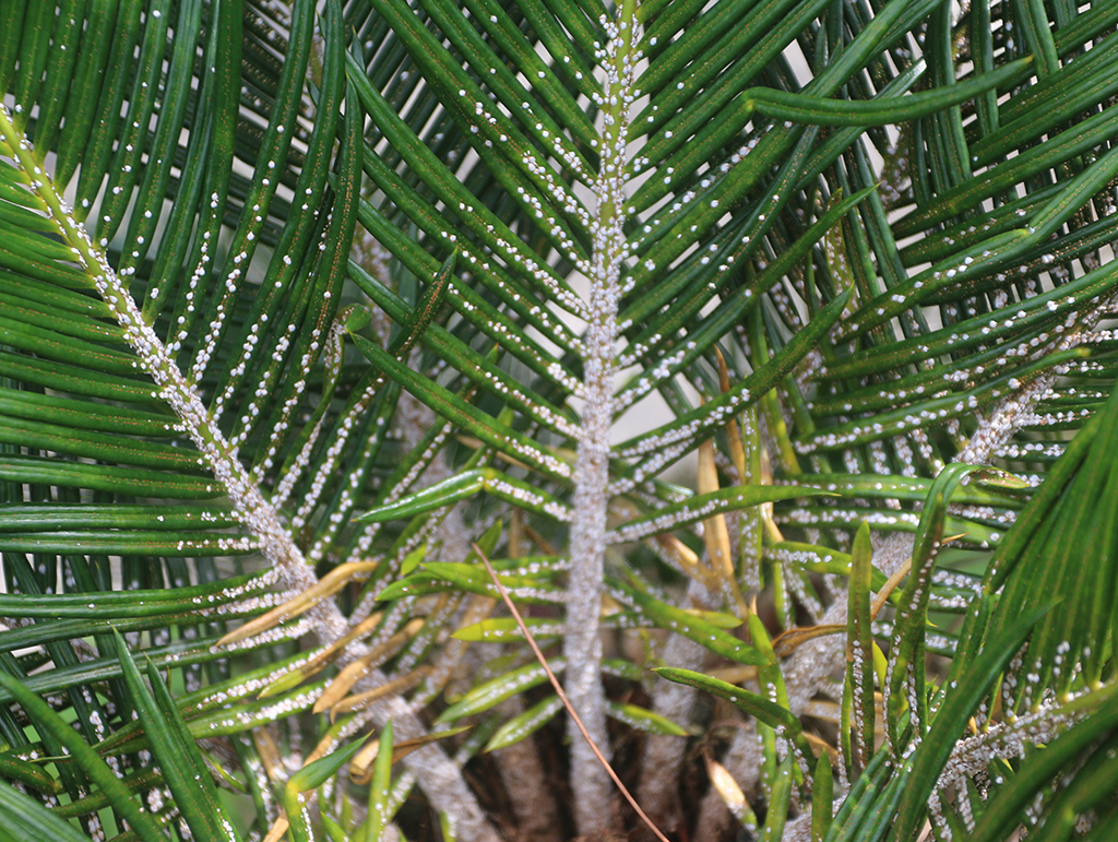 ソテツの葉に付着するソテツシロカイガラムシ。被害の拡大を食い止めることができない状況が続いている