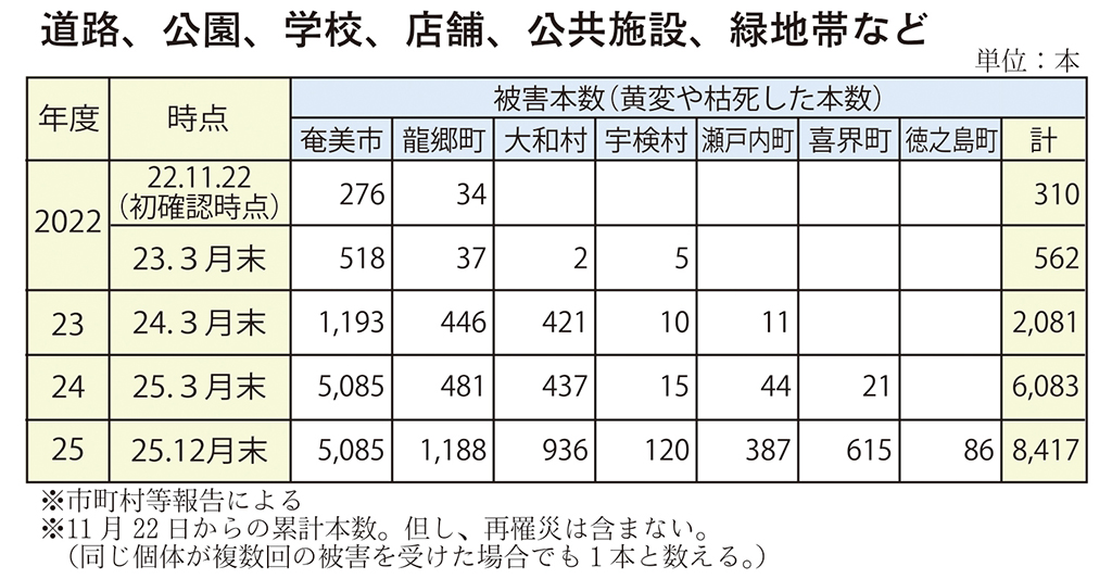 市町村など報告による被害状況(道路、公園、学校、店舗、公共施設、緑地帯など)をみると、被害本数は奄美市の5085本が最多で、全体の6割を占めるが、昨年3月末の報告から変動はない。次いで龍郷町1188本、大和村936本、喜界町615本などの順で続く。森林の被害面積は奄美大島のみの報告となっており、計500㌶。最多は奄美市(245㌶)で、龍郷町(134㌶)が続く。