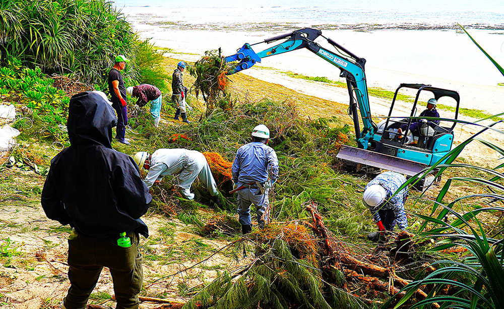 午前中は、東西約1㌔の範囲内で、砂浜に侵入してコロニー状に繁殖したモクマオウ稚樹の抜き取り作業に力を合わせた。併せて防風・防潮林内の遊歩道沿いに繁茂した枝葉や雑草の除去も実施。午後からは、防風林の一角の林床を覆い尽くし樹上にまではい上がったポトスの一掃作業に取り組んだ。