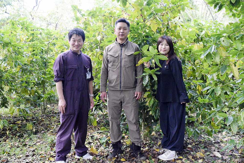 コーヒー栽培を手掛ける農園で米澤所長(中央)ら生産スタッフ