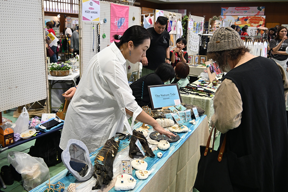 会場では「大島紬」「アダン」など奄美の素材を生かした展示・販売作品が多く並んだ「ハンドメイド」ブース52店舗をはじめ、ワークショップやフードブースなど全84店舗が展開。10周年を記念し、歴代大賞作品が展示され、色紙(いろがみ)を貼ってウォールアートの完成を目指す企画も。作家作品が当たる抽選会も開かれ、多くの家族連れが楽しんだ様子だった。
