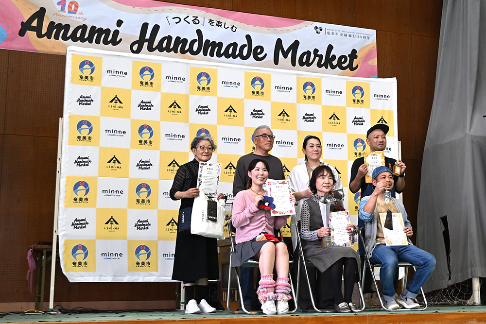 奄美群島の手工芸品が一堂に会する「第10回あまみハンドメイドマーケット」(奄美市、㈱しーま共催)は23日、奄美市名瀬の旧大島工業高校で開かれた。10周年の節目を迎えた会場では記念イベントも開かれ、過去最多となる約3000人が来場。あまみハンドメイド大賞の授賞式もあり、グランプリに輝いた奄美市の「ふふるん 吉村妙子」さんらに賞状が手渡された。