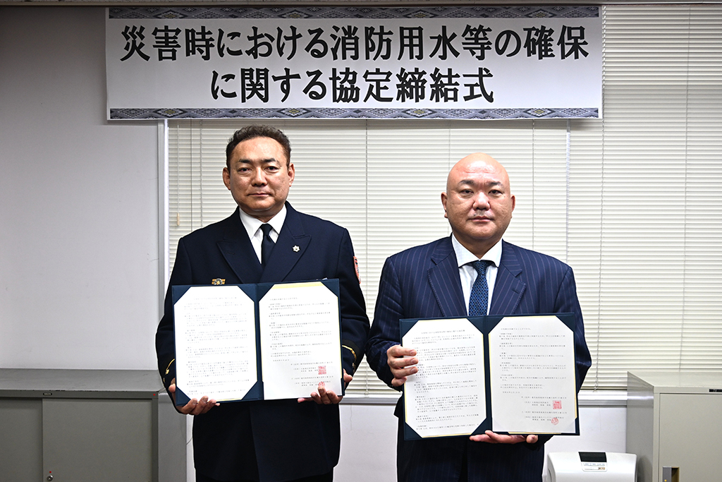 協定は火災、特に水利確保が困難な山林火災などの発生に備え、飲料水を除く生活用水や消防用水の供給に向けて協力を仰ぎ、災害対応を図ることが目的。奄美群島の消防本部との同協定締結は徳之島地区消防組合(2017年)、沖永良部与論地区広域事務組合(2018年)に続き3例目。