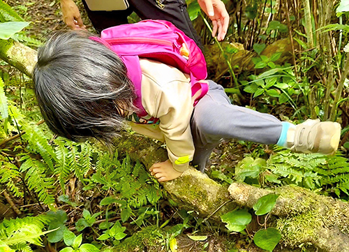 世界自然遺産の島のコア地域であり、奄美群島国立公園特別保護地区でもある深い森は、子どもにとっては巨大な遊び場だ。道端で見つけたノシランの鮮やかな実を眺めたり、サクラツツジの花に触れたり。落ち葉やツルを遊び道具に変えながら、五感で自然を楽しみ、力強く歩みを進めた。