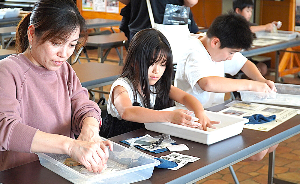 縄文アクセサリーづくり(勾玉研磨)を体験する家族連れ
