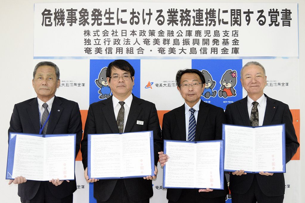 奄美大島信用金庫(伊東寛久理事長)、奄美信用組合(手島博久理事長)、奄美群島振興開発基金(藤井隆理事長)、日本政策金融公庫鹿児島支店(野村直行支店長)の県下4金融機関は11日、「危機事象発生における業務提携に関する覚書」を締結した。自然災害などの大規模災害発生時には、資金繰りや情報提供といった事業者支援で協力し、早期の復旧につなげる。