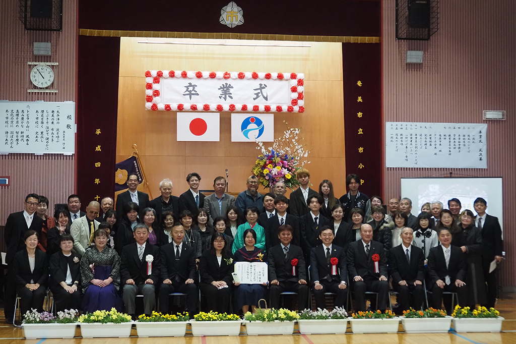 奄美市住用町の市=いち=中学校(木場敏朗校長)で11日、第72回卒業式があった。最後の卒業生の中村海莉=かいり=さんを、これまでの卒業生や地域住民ら約80人が祝福。たった1人の卒業生の成長した姿に別れを惜しみながら新たな一歩を踏み出す姿を見届けた。