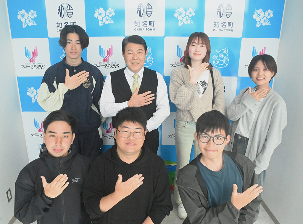 【沖永良部】就労しながら島暮らしを体験する「知名町ふるさとワーキングホリデー」で同町を訪れている大学生6人が13日、同町の今井力夫町長を表敬訪問し、島での生活の魅力や将来の進路について語り合った。