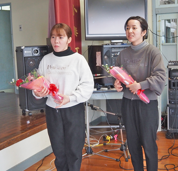 ゲームなどで遊んだ後に、参加者からのエールがあり、「八月踊りなどで2人が参加してくれて若返った感じが良かった」「小湊町内に住んでくれてありがとう」―などで会場を包んだ。欄さんは「徳之島から来て親元から離れての生活は不安だったが、皆さんが優しく、野菜などを頂いたりしたので感謝」、凜さんは「今は小湊に住んでいないのに、送別会まで開いてくれてありがたい。小湊に住んでうれしかった」とそれぞれお礼の言葉を述べた。