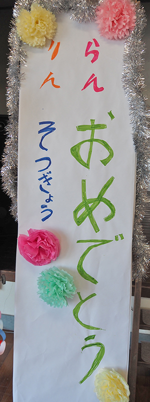 2人は1年生の時に1年間小湊町内で住んでいた頃に、地域の行事に積極的に参加。高齢者が多い中、八月踊りや稲刈り、忘年会など地域住民らと協力して手伝いなどをしたことから、住民らが有志でお別れ会を計画したという。会場には小湊小学校1年生の大城和樹君(7)が「らん・りん、そつぎょうおめでとう」と書いた看板もあった。