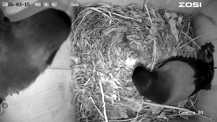 3月15日午前になって、卵の殻をくちばしでくわえるメスの姿が見られたことから確認すると、2羽がふ化していたという。