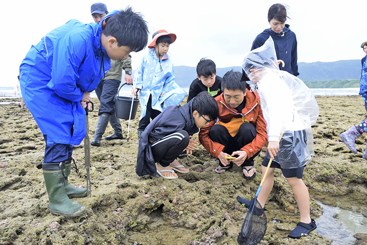 この日は干潮に合わせた午後1時に講座がスタート。親子らはムシ採り網などを手に潮だまりをのぞき見ながら、ウミウシやヤドカリ、ヒラムシを見つけては歓喜の声。恐る恐る手に取ったり、感触を確かめたりと、奇妙で神秘的な生態に親しんでいた。