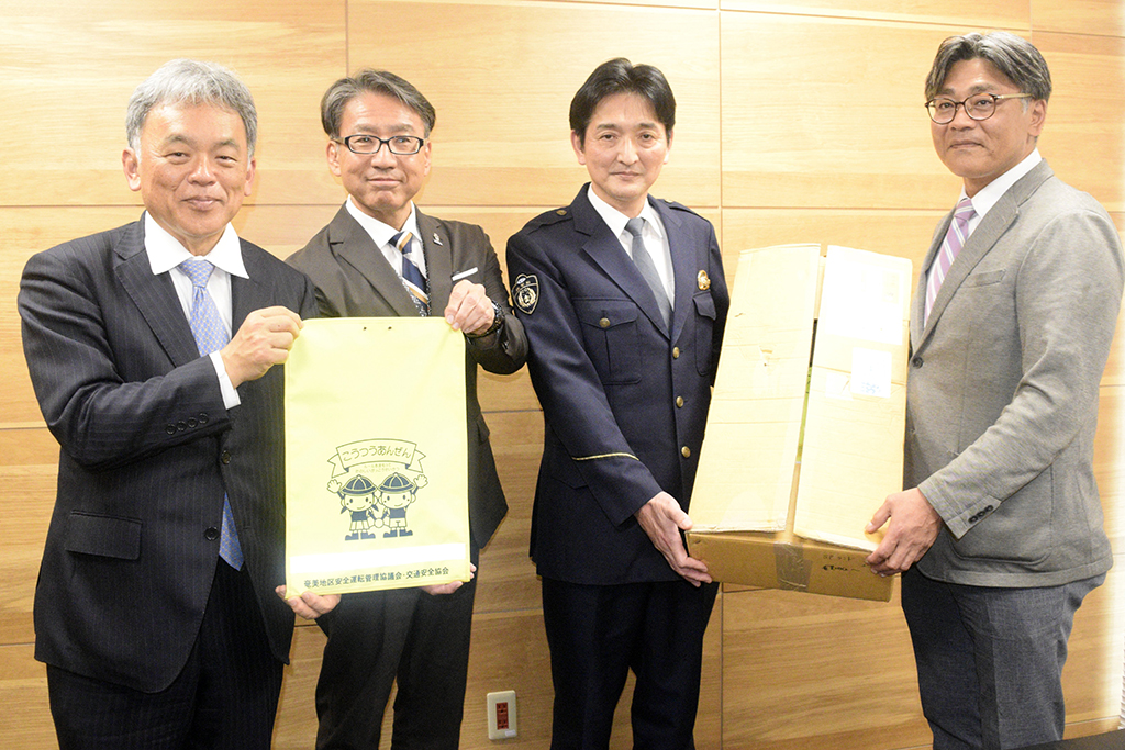 同協議会、同協会、奄美署が合同で実施。児童の登下校時の交通安全を願い、毎年届けている。