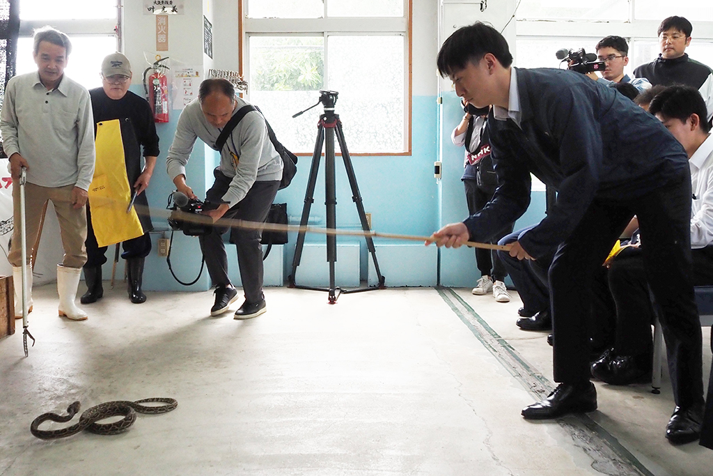 捕獲実習では、体長1・6㍍のハブが床に放たれ、舌を出して威かくする本物と向き合った。職員は、ハブ取り棒で素早く首根っこを捕まえて箱に入れたり、代用品の細長い竹で頭を何度もたたいて気絶させるなど、撃退を試みた。