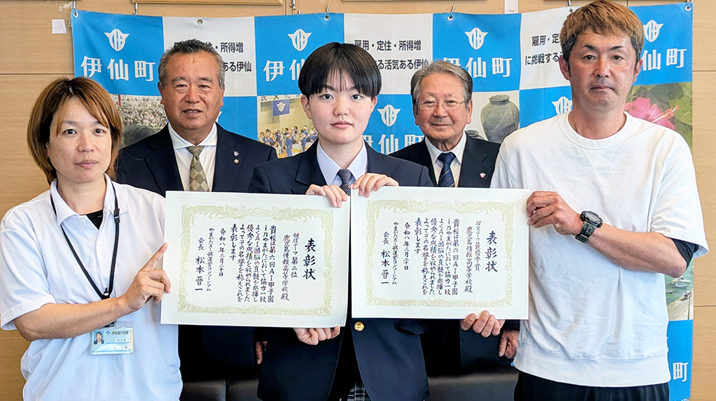 【徳之島】高校生や高専生が人工知能(AI)の技術成果を競う全国大会「第6回AI甲子園inやまがた」(3月20日、山形県で開催)で、鹿児島情報高校1年の實村心香(みむらこのか)さん(16)=伊仙中出身=が「探究部門」最優秀賞で優勝、同校の2連覇に貢献。さらに「競技部門」準優勝に輝いた。實村さんは3日、両親と伊仙町役場を訪れ、伊田正則町長らに全国制覇を報告した。