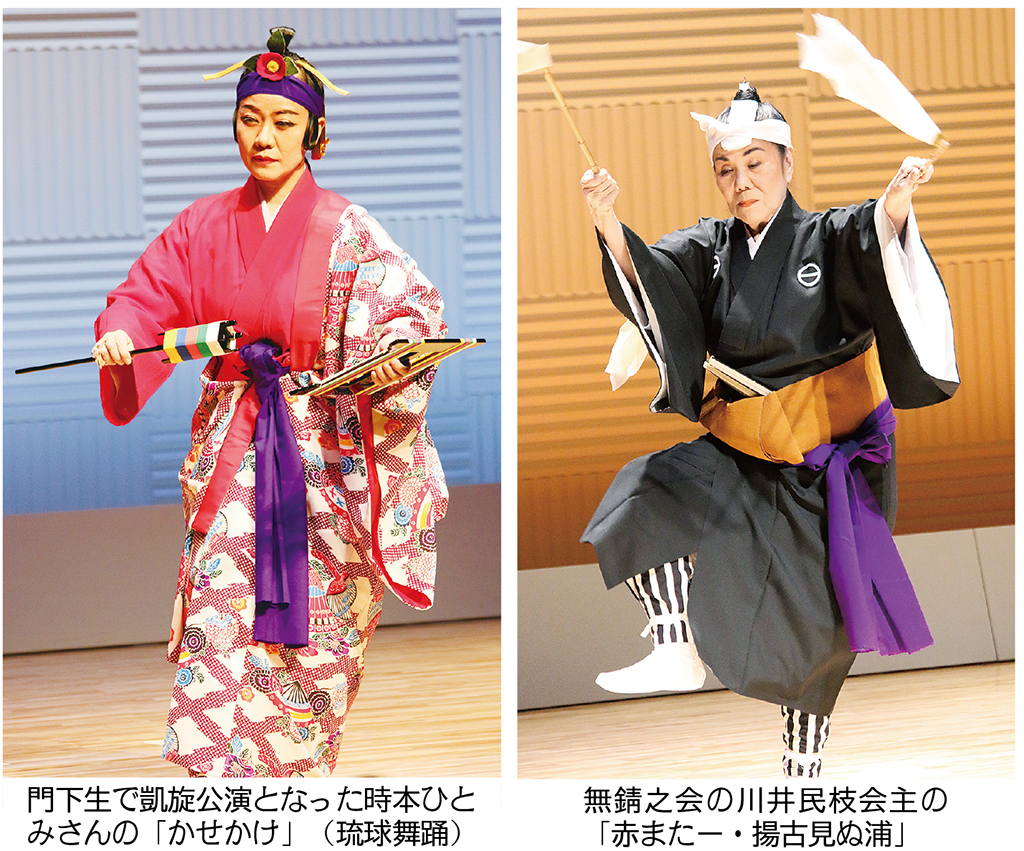 公演は3部構成。1部は勤王流舞踊の手として二十二の手形の説明から始まり、糸巻踊りの「かせかけ」(琉球舞踊)「かしかき」(八重山舞踊)の違い、同じ「鳩間節」でもしっとりとした正調とアップテンポの早弾きと、それぞれの魅力も届けられた。2部は南条かつみさんのショー、3部は仲宗根充さん(沖縄県指定無形文化財保持者)の民謡ライブなど盛りだくさんの公演となった。