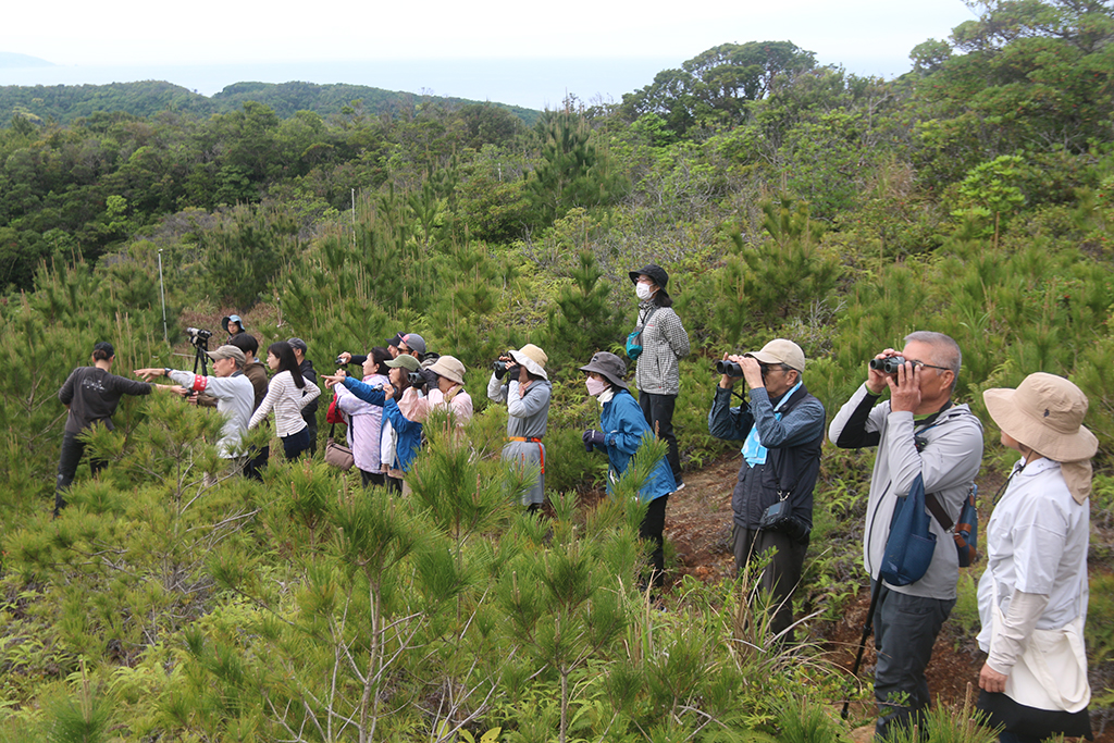 県道と市道笠利崎線の分岐点を集合場所に午前8時過ぎから開始。今回の探鳥会は同会の鳥飼久裕副会長が担当した。会員など20人が参加したが、探鳥会の情報を得て前日の11日に来島したのが大阪府高槻市の川本孟(たけし)さん(82)妙子さん(82)夫婦と、八部(やべ)保子さん(68)の3人。